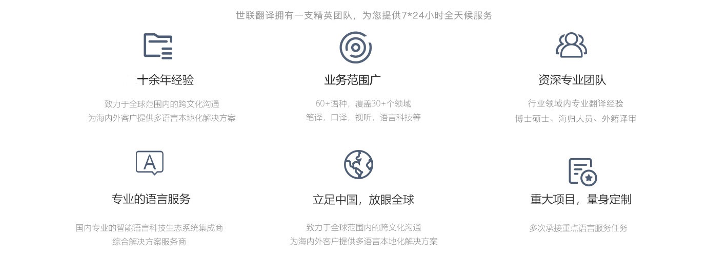 “在這5年中,世聯(lián)翻譯公司人員對(duì)工作的認(rèn)真、負(fù)責(zé)、熱情、周到深深的打動(dòng)了我。不僅譯件質(zhì)量好,交稿時(shí)間及時(shí),還能在我司資金周轉(zhuǎn)緊張時(shí)給予體諒。”